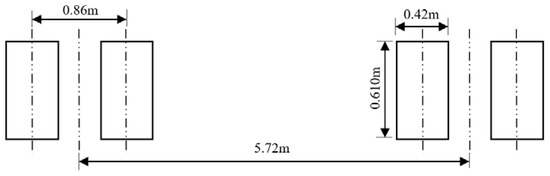 Combined with domestic and international research, the use of structured mesh helps to improve the calculation accuracy, so a rectangular shape is chosen to simulate the load contact surface. The selected role model is B-737-800 for which the load parameters are as shown in Table 1, because the dynamic load of the landing aircraft is unstable, so the quasi-static load of the taxiing aircraft is used to simulate the aircraft load, and the simulation of the aircraft load is realized by constantly moving the load surface and applying the load to the No. 5 plate several times [27], as shown in Figure 7. Moreover Figure 8 shows the main landing gear form of B-737-800.