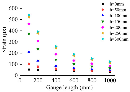 The cracks were set up according to the crack locations shown in Figure 9, and the length of the control crack was 1250 mm, and the height of the crack was varied from 0 mm to 300 mm, with an interval of 50 mm for each condition. The sensor scale distances were taken to be 100 mm, 200 mm, 400 mm, 600 mm, 800 mm, and 1000 mm. The corresponding sensor strain at the crack location was extracted by applying a B-737-800 model load at the crack location. As shown in Figure 11, when there is no crack, the measured strain does not change as the distance increases; controlling the height of the crack remains unchanged, the damage information of the crack is gradually submerged as the distance of the sensor increases, and as the height of the crack increases, the faster the damage information of the crack is submerged.
