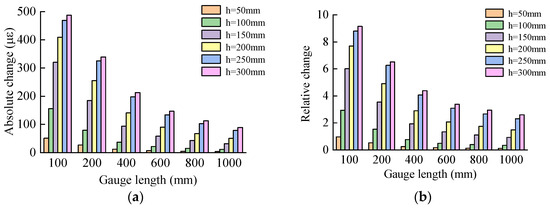 Figure 12 shows the absolute and relative changes in strain at different scale distances after the crack is carried out. From the figure, it can be seen that the smaller the scale distance of the sensor is, the larger the absolute and relative changes of the measured strain are. When the scale distance of the sensor is taken as 100 mm, the absolute change can reach about 500 με, and the relative change can reach 950%, which can obviously identify the crack; however, when the scale distance is taken as 1000 mm, the maximum absolute change is less than 100 με, and the relative change is about 300%, which makes it impossible to carry out the crack identification when the height of the crack is small. At the same time, in order to control the number of sensors and meet the minimum spacing requirements of fiber grating, the longitudinal seam sensor spacing is taken as 500 mm which is more suitable.