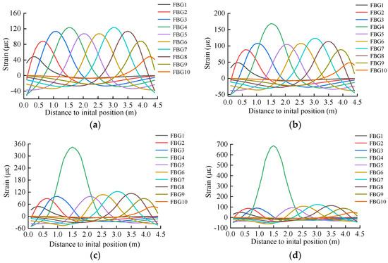 When a crack occurs at the sensor location, the strain peak monitored by the sensor will increase significantly, resulting in a significantly outwardly expanding strain curve, which increases the strain curve envelope area, as shown in Figure 3d. The strain curve envelope area of the sensors adjacent to the crack location will be slightly affected, and the curve envelope area of each sensor location can be constructed as a series after the crack appears.