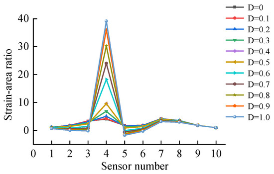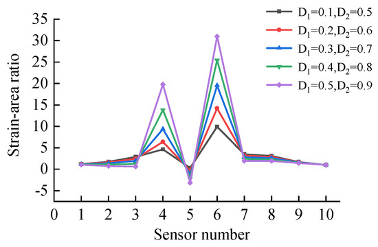 Figure 16 shows that as the degree of crack development increases in two different locations, the peak strains of sensors No. 4 and No. 6 increase, and the strains measured by the other location sensors change less. Calculating the envelope area ratio of the strain curve at each sensor position, the distribution curve is obtained as shown in Figure 17, which is consistent with the single crack identification results. Therefore, this method can be utilized to identify multiple cracks.
