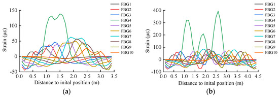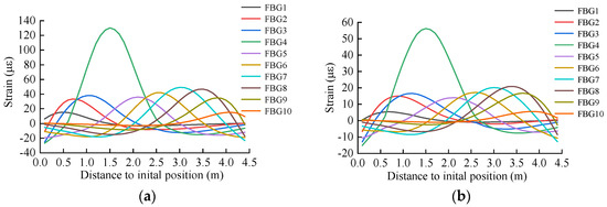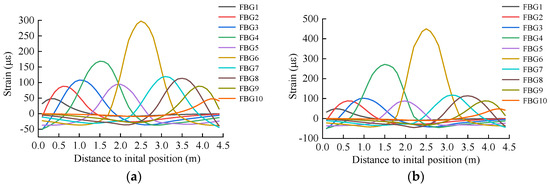 Strain change curve of each sensor under different loads: (a) D = 0.3 and (b) D = 0.6.