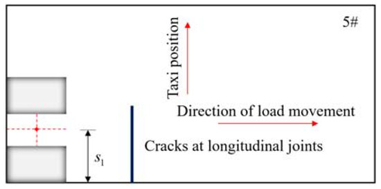 Different types of airplanes are unable to identify the cracks due to the different wheel spacing of the main landing gear and the main landing gear spacing, resulting in the fact that the skidding trajectory of the airplane is not necessarily at the board edge position during the taxiing process, and the deviation of the sensor position from the loaded position makes the measured strain decrease and the strain curve characteristics not obvious, etc. Therefore, it is necessary to analyze and discuss the skidding position of the airplane. In the case of D = 0.5, the envelope area ratios of the strain curves of different sensors are calculated, respectively, at the load center distance from the longitudinal edge position of 0.2 m, 0.4 m, 0.6 m, 1.2 m, 1.4 m, and 1.6 m, to determine whether the crack identification is possible. As shown in Figure 18, a schematic diagram of the aircraft taxiing position, the distance from the load center to the longitudinal edge of the B-737-800 model is .