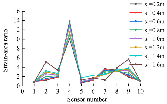 Figure 19 shows the strain change curves of each sensor location under the conditions of 0.6 m and 1.2 m, and it can be found that with the increase of , each strain peak decreases with the increase of the distance between the load and the sensor, and the maximum strain decreases by 60 με. Calculate the envelope area ratio of the strain curve at each sensor location, and obtain the distribution curve as shown in Figure 20; at the crack location, the envelope area ratio of the strain curve decreases with the increase, and the envelope area ratio of the strain curve at other locations almost does not change, so it can be seen that the airplane taxiing position has only small effects on the crack identification method in this paper.