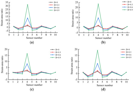 Strain variation curves of each sensor under different degrees of cracking: (a) D = 0, (b) D = 0.3, (c) D = 0.6, and (d) D = 0.9.