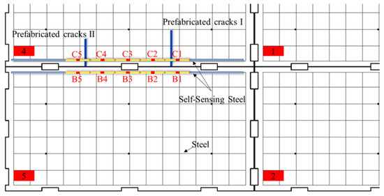 In summary, the sensor spacing is selected as 500 mm, and 10 FBG sensors are distributed on the self-sensing reinforcement, numbered as . The self-sensing reinforcement is 0.15 m from the edge of the plate and 0.05 m from the bottom position of the plate, as shown in Figure 13 for the self-sensing reinforcement layout schematic.