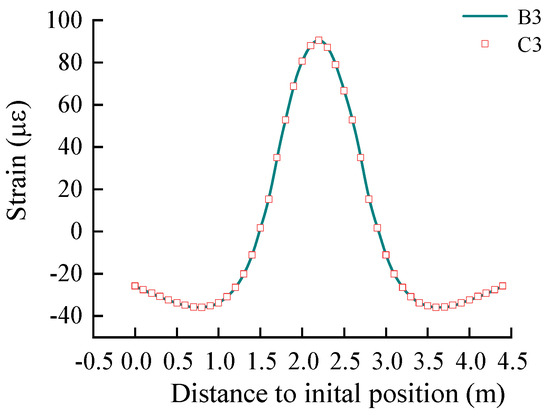 It is only necessary to set the crack location within the marked distance segment of the FBG sensors and the number of sensors is not limited. Therefore, according to Figure 24 to lay the self-sensing rebar, one only needs to lay a self-sensing rebar in the position of plate No. 4. For each self-sensing rebar, set up five fiber optic sensors. The scale distance is taken as 150 mm, which is set up in the C1 sensor position of 30 cm × 10 cm of the preset crack, in the C5 sensing position of the preset crack set up 24 cm × 8 cm. The use of C1~C5 to monitor the pavement before and after cracking the strain change curve of each sensor. Due to this test preset crack, the sensor cannot be monitored to get the No. 4 plate without cracking the strain change curve of each sensor. Therefore, a self-sensing rebar is deployed at the longitudinal edge of plate No. 5, as shown in Figure 24, and the strain data obtained from B1~B5 are utilized to replace the strain data obtained from each sensor when there is no cracking in plate No. 4. The feasibility of this scheme was analyzed using finite elements; as shown in Figure 25, when no cracks were generated in each plate, the strain change curve generated by C3 when the aircraft load was taxiing at the longitudinal edge position of the No. 4 plate coincided with the strain change curve generated by B3 when the plate was taxiing at the longitudinal edge position of the No. 5 plate, and thus the test scheme could be implemented.