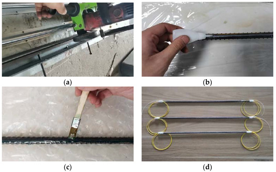 According to the monitoring program of this paper, the marking distance of the self-sensing bar in the actual road surface is 500 mm, and the marking distance of the self-sensing bar in the small-scale model test is 150 mm, so the self-sensing bar with a marking distance of 150 mm is produced and a tensile test is carried out to investigate its strain sensing performance. The specific production process as shown in Figure 26, with a self-sensing steel bar component length of 60 cm; first of all, the steel bar tooling groove, to ensure that the groove is uniform, the width and depth of the groove is taken for the 2 mm × 2 mm, followed by the paste of bare optical fiber, the bare optical fiber is placed in the groove, threaded into the corresponding distance length of the plastic tube, the use of glue will be pasted; and finally, the epoxy resin is injected into the groove, to ensure that the groove epoxy resin filled uniformly. Following the above steps completes the self-sensing steel production.
