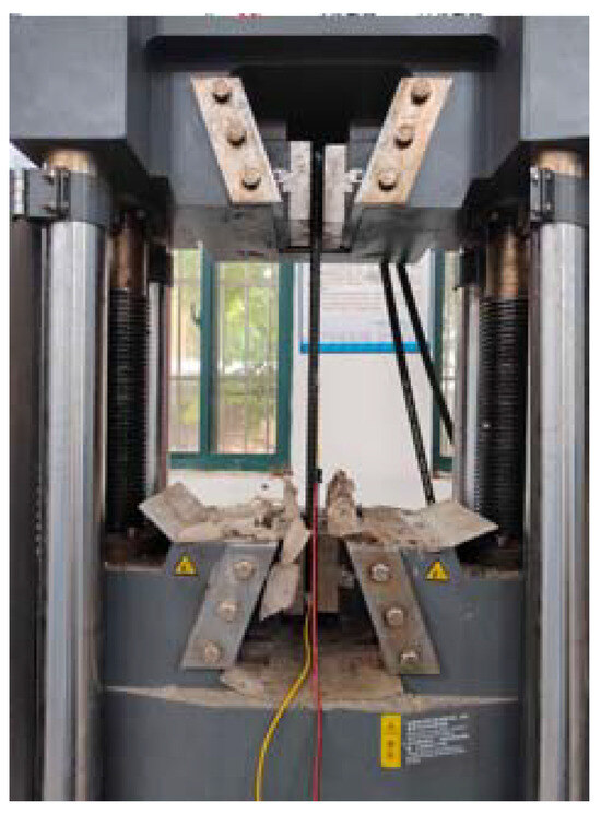 The universal tensile testing machine is used to tension the self-sensing rebar, as shown in Figure 27. The steps and rate of rebar tensioning are adopted from the specification standard [31], the load control is adopted in the elastic phase, and the control load is taken as 1 kN/s. The displacement control is adopted in the yielding phase of the rebar and the reinforcing phase, and the control displacement is taken as 30 mm/min. When the concrete slab is subjected to the cracking by the aircraft loading and the external temperature and humidity, at this point in time, under the aircraft loading. Under the action of the aircraft load, the strain of the reinforcement at the cracked position of the concrete can reach about 1000 με, so the self-sensing reinforcement is loaded to 1000 με and then the test is stopped.