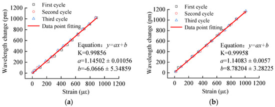 As shown in Figure 28, the wavelength change of the self-sensing bars is plotted against the measured strain change. It can be found that the wavelength change and the strain change show a significant linear relationship, and the linear correlation coefficient is higher than 0.99 under each working condition. As shown in Table 6, the average value of the strain sensing coefficient is 1.1425, and the coefficients of variation are 0.1580% in order, which indicates that the self-sensing rebar with a marking distance of 150 mm has a stable strain sensing performance.