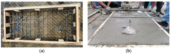 Sensor mounting and plate fabrication: (a) Placement of rebar and (b) Plate leveling.
