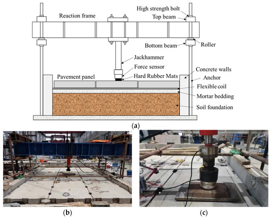 The test schematic is shown in Figure 30a, and the vertical structure of the pavement mainly consists of soil base, mortar bedding layer, flexible coil and pavement panel. First of all, 400 mm thick soil layer, and the use of tamping machine will be tamped soil base; this is followed by cement mortar paved in the soil base of the upper part of the mortar bedding thickness of 30 mm, and the use of vibrators will be mortar bedding vibration, and complete the bedding layer leveling work; this is then laid in the upper part of the bedding layer of flexible coil to increase the pavement panel and the grass-roots level of the degree of adhesion; and finally, the pavement panel prefabricated and welded work is completed. The test loading device mainly consists of reaction frame, jacks and anchors, as shown in Figure 30b for the completion of the test device. The B-737-800 model load is applied, as shown in Figure 30c.