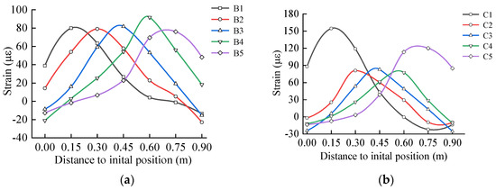 Strain variation curves of each sensor at different distances from load center to longitudinal side: (a) s1 = 0.6 m and (b) s1 = 1.2 m.