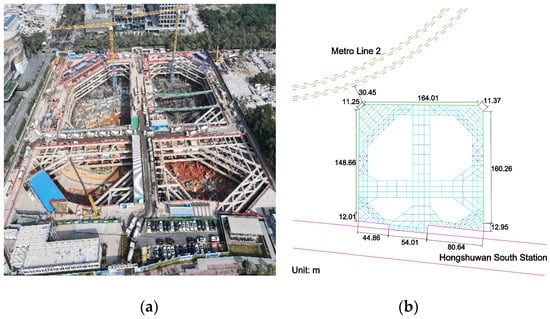 26]. These studies ingeniously combined actual engineering with numerical simulation methods, but often only focused on the formation of foundation pit support schemes, lacking comparison with field monitoring data regarding the accuracy of numerical model results. Therefore, to meet the demand for safely, efficiently, and economically constructing deep and large foundation pits, it is necessary to ensure the accuracy of numerical calculations when predicting and controlling the deformation effects of soil disturbance caused by foundation pit excavation on complex existing underground structures.