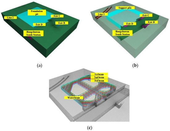 In this study, a three-dimensional numerical simulation model was established to clarify the degree of influence on nearby subway facilities under different working conditions. After calculation, the internal forces of the supporting structure and the deformation near the foundation pit were obtained. The purpose is to study the deformation impact of a reasonable support scheme on excavation of a foundation pit when facing a nearby existing subway. At the same time, the monitoring data of control points were compared and analyzed with the numerical simulation results to ensure the accuracy and reliability of the calculations. The project environment on which this study is based is complex, with the Hongshuwan South Station and Subway Line 2 nearby, which still poses high requirements for design and construction technology. The relevant solutions can provide experience and references for similar projects.