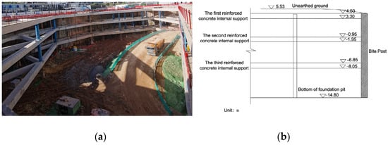 17] proposed a new type of H-shaped steel support system and conducted on-site monitoring research based on a foundation pit engineering project in Shanghai. They analyzed the pile displacement with construction stage changes and verified the applicability of this new support system. The use of this support system can shorten the construction period, reduce costs, and effectively improve green construction levels. Sun and Li [