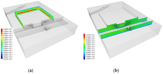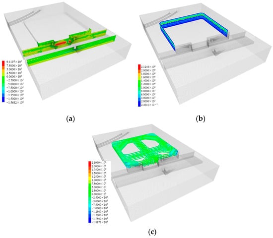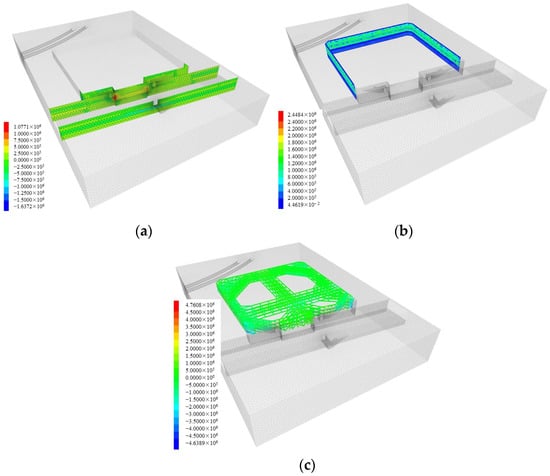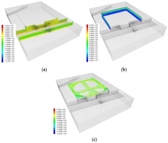 Figure 9 provides cloud maps of the internal forces of the support structure and internal support when the pit is excavated to the bottom. From the numerical model results, it can be observed that the maximum bending moment of the contiguous wall is 2.38 × 106 N·m, located at the southwest corner of the contiguous wall, at the bottom of the pit. At the corner where the shared contiguous wall connects with the newly constructed contiguous wall, the bending moment is also significant, at 1.38 × 106 N·m. The maximum bending moment of the support pile is 4.90 × 106 N·m, mainly occurring around 4 m above the bottom of the pit, where the soil layer consists mainly of gravel and silty clay. The maximum axial force of the internal support is 8.42 × 106 N, mainly distributed at the southeast and southwest corners of the pit.