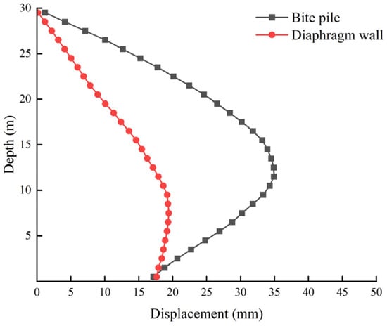 Analyzing the curves reveals that as the depth increases, the lateral displacement of the support structure also increases due to the increasing difference in soil pressure inside and outside the pit. However, as the pit depth approaches the bottom, the support structure experiences strong constraints from the bottom soil, resulting in reduced lateral displacement. Therefore, the maximum lateral displacement of the support structure appears near the middle depth of the pit. Additionally, due to the differences between bite piles and underground contiguous walls, there are differences in the maximum lateral displacement values and corresponding depths, with bite piles exhibiting larger lateral displacement and deeper pit depths compared to underground contiguous walls. This is mainly because underground contiguous walls are made of reinforced concrete, providing higher stiffness and stability to withstand greater horizontal loads. Furthermore, during actual pit excavation, deformation monitoring of both support structure forms should focus on the bite pile support structure to ensure that monitored values are below safety control standards.