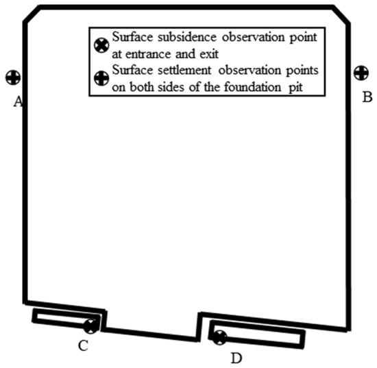 The large-scale unloading of soil caused by pit excavation will inevitably disturb the surrounding soil. To observe the range and degree of this disturbance, points were selected on the south side of the pit near two subway entrances and on the east and west sides, labeled as points A to D, as shown in