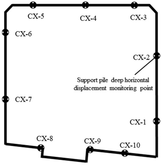 (5) The deep horizontal displacement monitoring values of the pit support piles obtained through numerical simulation are consistent with the numerical simulation results and have a certain safety margin. Designing the support system based on this can achieve the goal of safe, efficient, and economically sound construction of deep pits in actual engineering.