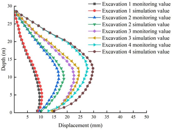Figure 4, it can be observed that during the pit excavation process, the maximum lateral displacement is mainly concentrated in the middle part of the support structure, with smaller displacements on both sides. This is because the bottom of the support structure experiences greater constraints, while the top receives less lateral soil pressure, leading to larger lateral pressure and weaker support constraints in the middle section. As the pit excavation progresses, the maximum lateral horizontal displacement continues to increase, corresponding to increasing depth, while the displacements at the top and bottom of the support structure remain relatively small.