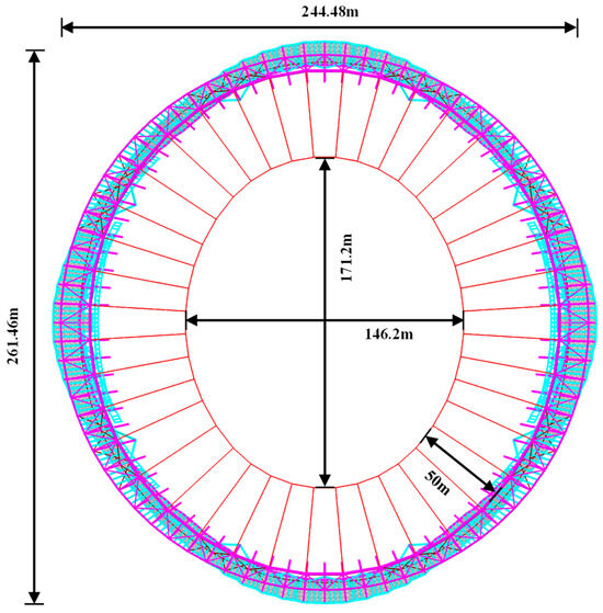 The roof of the Linyi Olympic Sport Center Stadium is a spoke-type single-layer cable net structure (Figure 1 and Figure 2) that is saddle shaped. Its plane is approximately circular. The central opening is 146.2 m wide in the long axis direction, 171.2 m long in the short axis direction, and the overhanging length of the membrane surface is about 50 m.