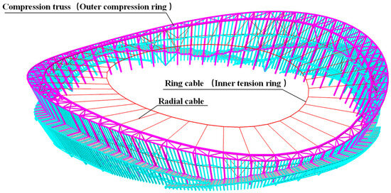 The spoke-type single-layer cable structure is similar to a bicycle wheel, consisting of inner tension rings, an outer compression ring, and radial cables [1,2]. As a full tension structural system [3,4], the spoke-type single-layer cable net structure has the characteristic of a beautiful and varied architectural appearance and can make full use of the material strength because a high-strength cable is used as the tension member. When using few compression members, this structural system can avoid structural instability problems and is known as one of the most efficient structural forms [5]. However, its structural characteristics have higher requirements not only in terms of the structural design and analysis, but also in construction forming technology.