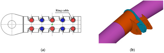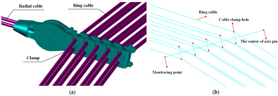 Considering that the monitoring points of ring cable clamp were attached to the ring cable clamp facing the center of the side of the field, the incline angle of the ring cables changed when the cable net was hoisted. Therefore, it was necessary to refine the original finite element model to obtain the coordinates of the monitoring points in ANSYS. According to the CAD solid model shown in Figure 18a, the finite element of the ring cable in ANSYS was subdivided into 10 loops to be as consistent as possible with the project. Monitoring points in ANSYS are shown separately, as shown in Figure 18b. The clamps of the ring cable were modeled in the element of BEAM 188 and the material stiffness was consistent with that of the rigid arm. The center point of the ring cable clamp was set as the main key point and the other point as the slave key point, then the rigid zone was established. The material type, member connection condition, loading condition, and construction condition were the same as the original analysis. The coordinates of the monitoring points were obtained from GC-1 to GC-7, as detailed in Section 4.1.2.