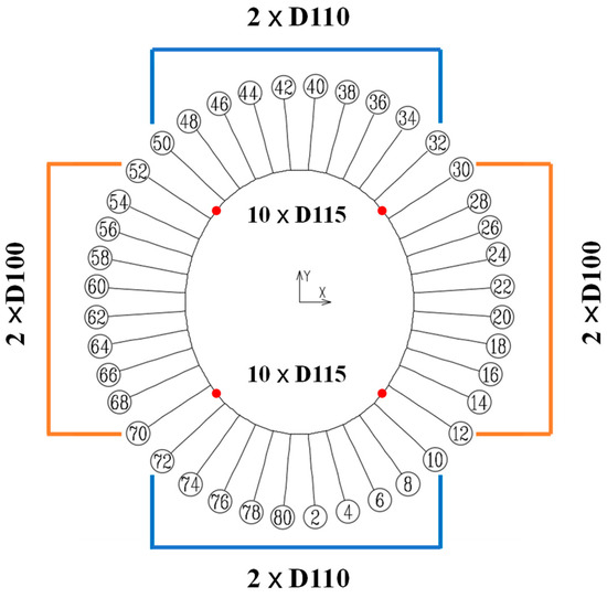 The cable net structure consists of 40 radial cables, each of which are double cables. An outer compression truss is used as the support member of the roof and the outer compression ring of the cable net. The inner tension ring is composed of 10 ring cables, and the diagram of the cables and cable clamp is shown in Figure 3. A Galfan full lock coil strand cable was used for both radial cables and ring cables, and their specifications and material properties are shown in Table 1. The numbering and layout of the cable is shown in Figure 4.