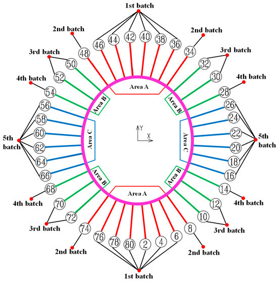 After considering the characteristics of the target engineering comprehensively, it was decided to adopt the construction scheme of “assembling on the ground with free stress, hoisting entirely using traction cables, and tensioning/anchoring in batches”. The radial cables were divided into three groups: A, B, and C (shown as Figure 5). Firstly, the radial and ring cables were assembled on the ground, and the traction devices were used in the outer compression truss to hoist three areas simultaneously. Then, area A was hoisted to the precalculated position, and the radial cables of area A were anchored to the pin-connected plate. Tension was continued on the cables of area B and C, then they were anchored chronologically. The construction scheme of the cables is shown in Figure 6.