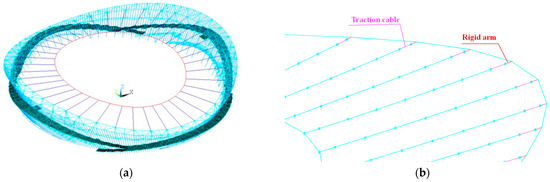 The finite element model of the structure was established in ANSYS 2019R1 according to the information from the structure designer, and the finite element analysis of the construction process was carried out. The finite element model in ANSYS included the outer steel compression truss, radial cables, ring cables, and clamps, as shown in Figure 7a. In ANSYS, traction cables were modeled, and rigid arms were established to simulate the pin-connected plate that connected the radial cables to the outer compression truss, as shown in Figure 7b.