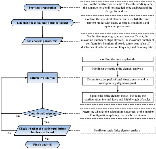 The construction process analysis of the single-layer structure net was based on the nonlinear dynamic finite element method (NDFEM) proposed by Luo [24]. Based on the theory of nonlinear dynamics, this method added the virtual inertial force and viscous damping force to establish the nonlinear motion equation of the whole structure, transforming the static problem into a dynamic problem. The NDFEM makes the dynamic equilibrium state gradually converge to the static equilibrium by iteratively updating the configuration of the finite element model. The cable net structure was in a static unbalanced state before the analysis and in the static balanced state during the analysis. Whether the structure is in static equilibrium or not will be determined according to the peak kinetic energy and time stagnation point obtained in the virtual dynamic process. When the finite element model converged, the nonlinear static analysis was carried out to check the static equilibrium state. The detailed flowchart of the NDFEM is shown in Figure 8.