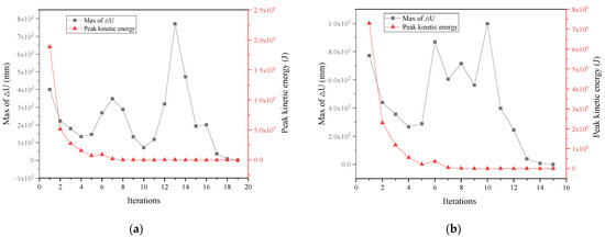 In order to check the convergence performance of the nonlinear iteration of the NDFEM, the inverse process of cable net hoisting in two stages, GK6 and GK7-GK11, was tested. That is, the cable network was lowered to the specified position by lengthening the traction cable. The iterative process is shown in Figure 9. The convergence standard of the maximum adjustment of cable structure coordinates was set to 1 mm. With the progress of iteration, the peak kinetic energy of the cable net steadily decreased until it was close to 0 mm. The maximum value of cable structure coordinate adjustment oscillated in the early stage, gradually decreasing steadily in the later stage. Finally, the iteration was completed when it was less than 1 mm, and the structural nonlinear calculation converged.