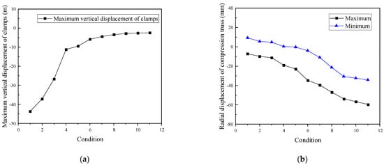 As Figure 20a shows, the radial deformation of eight measuring points decreased as the length of the traction cable decreased. The value of radial deformation developed from 0 mm in the initial state to 50 mm in the formed state compared to GC-1. Because the length of the traction cables decreased, the cable force increased and the outer compression truss was tensioned to move closer to the center of the field gradually. Therefore, the radial deformation increased.