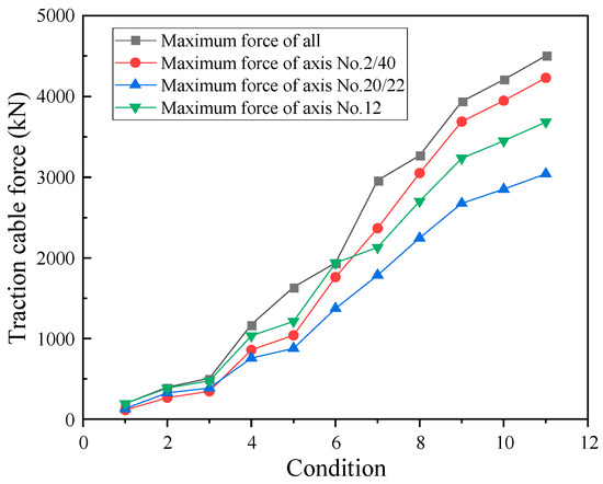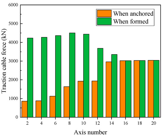 This engineering project is a quarter symmetrical structure, so the traction cable force in the symmetrical position is equal. After the axis number merged, the traction cable forces during construction were as shown in Table 6, where the bold and underlined value indicates the cable force under the current condition. It shows that the forces of the traction cables in area B/C were 1000 kN lower than those in area A when the structure formed. Because the cables in area B/C were anchored first, the traction forces when anchored were much smaller than those when formed in axis no. 2–12, as shown in Figure 12. Tensioning and anchoring in batches, compared to that synchronously, can decrease the traction forces and ensure the safety of cable construction. Furthermore, tensioning and anchoring in batches can reduce the labor cost of construction. All of these results prove the advantages of the method “tensioning and anchoring in batches”.