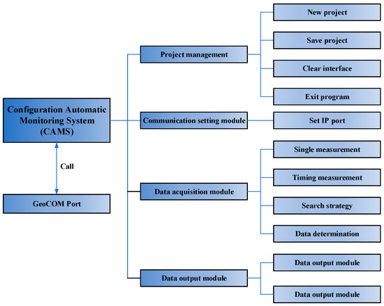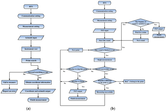 The software system framework of the CAMS is shown in Figure 13. The system consisted of three modules: communication setting, data acquisition, and data output. As the premise of normal operation of the system, the communication setting module ensures stable data communication between the computer and the RTS. As the core function of the system, the data acquisition module is divided into single measurement and timing measurement sub-modules according to the different number of measurement objects, and the search strategy and data determination sub-module are respectively the most important functions of the two measurement modules. The operation flow of the single measurement and timing measurement is shown in Figure 14. The data output module is divided into two sub-modules, which is convenient to operate.