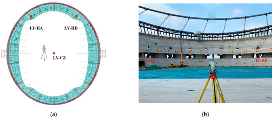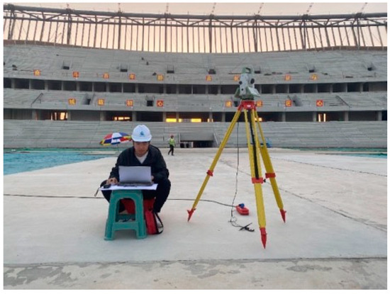 The monitoring scheme adopted the method of rear-view point to set up the measuring station. The center of the stadium was selected as the monitoring station numbered as LY-CZ. Two rear-view points were the reference points, the location of which should be arranged in a place that is easy to store for a long time, is not disturbed by the external environment, and has good visibility conditions. In order to set three points equidistantly, the two rear-view points, numbered as LY-HA and LY-HB, were arranged on the column of stand, as shown in Figure 15. During the monitoring, the azimuth angle between the measuring station and the monitoring point remained unchanged, and the height and position of the RTS were fixed. The measuring site is shown in Figure 16.