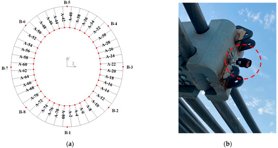 According to the characteristics of this type of engineering and monitoring points, there were 48 monitoring points arranged in the stadium, where 40 points were on the clamp of the inner ring cable and 8 points on the outer compression truss, as shown in Figure 17a. Forty monitoring points (A-2~A-80) were located near the center of the inner ring of the cable clamps, and were attached to the side of the cable clamp by an aluminum alloy adapter, as shown in Figure 17b. These 40 monitoring points were arranged to measure the configuration of the cable net to obtain the deformation data, which were used to compare with the simulated theoretical value from ANSYS, judge the safety of the structure, and adjust the configuration of the cable structure in mid-air. Another eight monitoring points were arranged on the outer compression truss to measure the radial deformation of the outer steel structure to ensure safety.