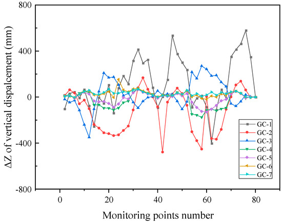 A-80, the lowest clamp, was taken as the datum point to obtain the theoretical and measured relative elevation, as shown in Figure 17a, that is, the elevation difference between the target point and the datum point, ΔZ1 and ΔZ2, respectively. The relative difference in elevation ΔZ = ΔZ1 − ΔZ2 was obtained, and the ΔZ from GC1 to GC7 was plotted, as shown in Figure 19.