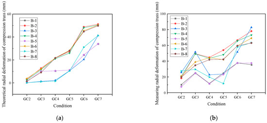 Due to gravity in the initial state, the measuring radial deformation of truss was not 0 mm, and the configuration was not the design zero state. There was an error between the measured value and the theoretical value. The measuring trend of general deformation was consistent with the theoretical analysis shown in Figure 20b. However, there was an anomaly, where the deformation of the latter condition was smaller than that of the previous condition, because the outer compression truss monitoring points of B-3 between GC2 and GC3, B-1 between GC3 and GC4, and B-3 between GC6 and GC7 were disturbed by accidental human intervention. Although it was corrected in time, its coordinates still showed a certain deviation. Considering the above factors, there were some errors in the radial deformation measured.