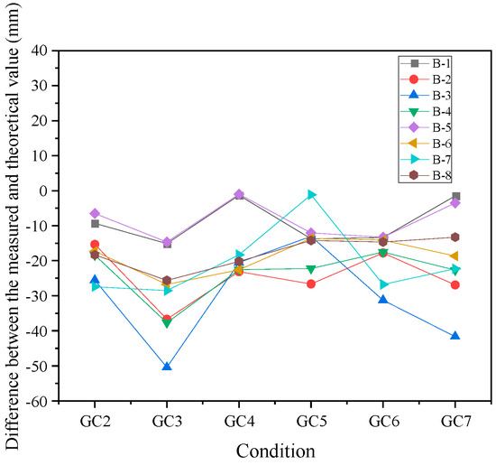 The difference between the theoretic and measured deformation is shown in Figure 21. The difference ranged from −50.43 to −1.01 mm. Compared with the initial state (GC-1), the maximum measured deformation (GC-7) was 82.9 mm, and the maximum theoretical deformation was 50.5 mm, with a difference of about 30 mm. Although there was a relative difference, considering the large scale of the structure and different construction seasons, the relative difference is acceptable. Construction was carried out safely, and the automatic measurement system can be recognized as having considerable accuracy.