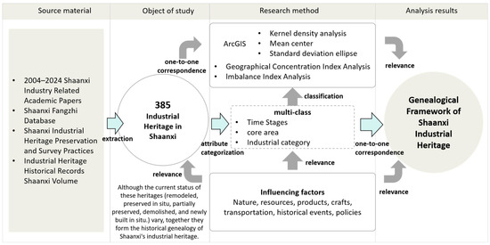First, we performed time phasing of Shaanxi’s industrial history by researching the related history and literature. We used the GIS spatial statistical analysis method, including kernel density [41,42], mean center, and standard deviational ellipse [43,44], and imbalance index analysis to examine the differences in distribution between various regions [22] and to study the spatial dispersion and agglomeration characteristics of Shaanxi’s industrial legacy sites in different stages and the trend of center shift [45,46]. The distribution of industrial heritage sites in Shaanxi was abstracted into point-like elements using GIS, and the correlation between industries and Shaanxi’s natural resources, product resources, traditional ancient industry base, transportation factors, and historical and political factors was analyzed. Finally, by overlaying various factors and creatively presenting the genealogical framework of Shaanxi’s industrial heritage in the manner of a Sankey diagram, the 385 industrial heritage sites were connected by directed arrows to the historical phases, industrial types, and the regions they are located in, and then, these arrows were extended to the nodes of the GIS map to show the flow and distribution of the data(Figure 2). Furthermore, to present a clearer framework of Shaanxi’s industrial heritage genealogy, we selected several key industrial heritage projects as case studies.