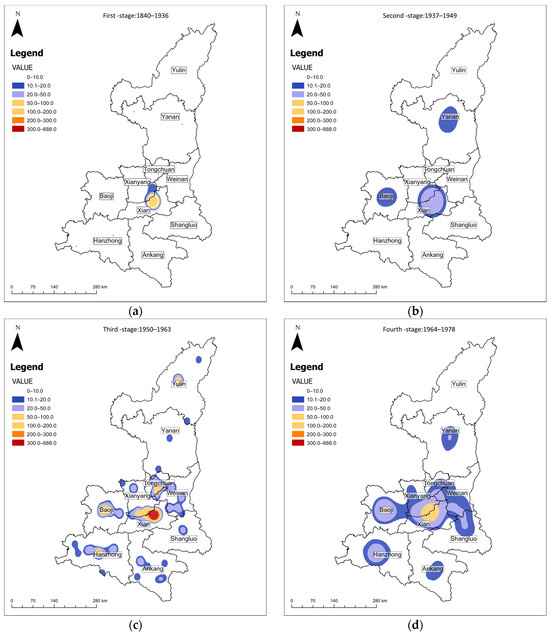 Figure 3. Kernel density map: (a) 1840–1936; (b) 1964–1978; (c) 1950–1963; (d) 1964–1978. - 1937–1949: During the Second Sino–Japanese War and the War of Liberation, the Longhai Railway was completed and opened to traffic, industrial enterprises relocated inward to Baoji, and agglomerations of industry were developed in Xi’an, Baoji, and Yan’an to meet the wartime needs of the Communist Party. The Industrial Co-operative Movement [58,59] also played a crucial role in this process. The main industries were machinery, paper and printing, and textiles. Because Central Shaanxi was an important cotton-producing area, the textile industry was mainly located in Xi’an and Xianyang, forming the Textile City Industrial Zone in Xi’an, and a textile industry based on cotton spinning developed. After the outbreak of the Second Sino–Japanese War in 1937, factories producing armaments rapidly became established in Baoji and Yan’an (Figure 3b). Most of these factories belong to the mechanical industry.