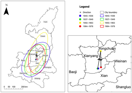 - We obtained the map depicting the direction of movement of Shaanxi ’s modern industries in Figure 4 by superimposing the standard deviation ellipses from the four periods. This map reveals the directional characteristics of the distribution of modern industry in each period: namely, the shifts during the first two periods were not significant, whereas the Soviet aid and the implementation of the Three Lines Construction significantly altered the central location of Shaanxi’s industries.