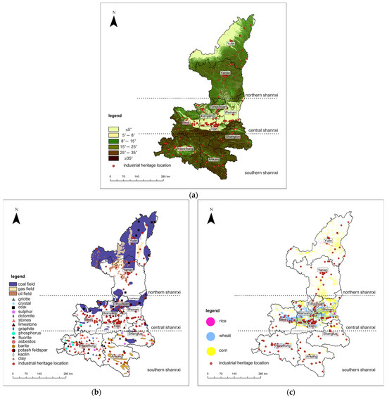 (a) Geographic map of Shaanxi; (b) resources map of Shaanxi; (c) product resources map of Shaanxi.
