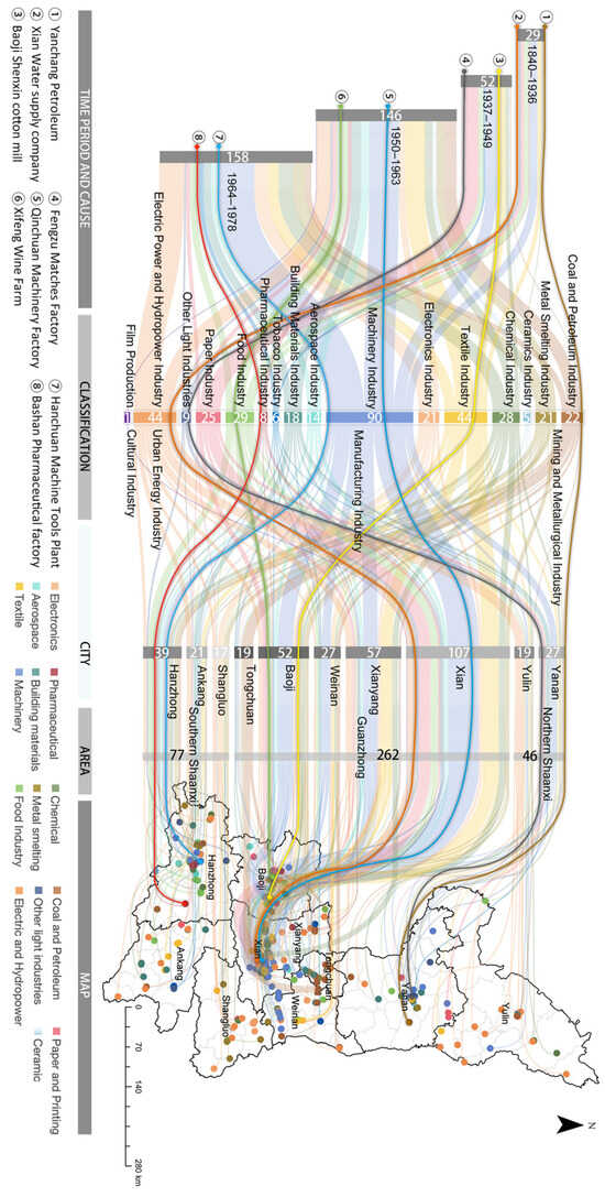 Shaanxi’s industrial heritage is characterized by diversity, multiple sources, and a wide distribution, adding complexity to the framework of its genealogy. In the process of establishing the framework, the development and evolution path of Shaanxi’s industrial heritage cannot be depicted from only a single perspective. Therefore, we used a Sankey flow diagram to present Shaanxi’s industrial heritage genealogical framework, which displays the flow and distribution of data by connecting the historical phases, industrial types, and regions through directional arrows and extending the nodes connected to the GIS map. Unlike the traditional Sankey diagram, in this genealogical framework, the flow direction of the arrows is reversible, and it is also possible to trace back the type of industry and the period in which it is located through the corresponding points of the industrial heritage in the GIS map.