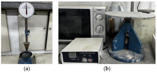 According to Figure 3a, the consistency test was conducted by using a mortar consistency meter with reference to specification [27] JGJ/T70-2009 “Standard of Test Methods for Basic Properties of Building Mortar”. The slurry was poured into the container in two stages and fully pounded, and at the same time, the container was knocked to ensure that the slurry was dense. Each group of specimens was measured once 0 h, 3 h, 6 h, and 9 h after the completion of the sample making, and the result of the test is expressed by the consistency value in cm. According to Figure 3b, slump test specification with reference to GB/T2419-2005 “Measurement Method of Cementitious Sand Fluidity”, the cement mortar fluidity tester was used to carry out the test. The test mold was placed in the center of the jumping table, and the specimen was poured into the test mold in two layers and pounded well. The jumping table was set to jump 25 times at a frequency of once per second. After the table jumping, we used a ruler to measure the diameter length of the spreading slurry at each vertical end and took the average value as the result of each group of specimens in the sample making after 0 h, 3 h, 6 h, and 9 h.