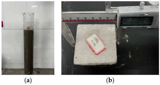 According to Figure 4a, the bleeding test followed the specifications of [28] JC/T 2153-2012 “Test Method for Cement Bleeding”, using a 1000 mL graduated cylinder. First, the mass of the cylinder was measured; then, the freshly prepared slurry was poured into the cylinder. The total mass of the cylinder and slurry was measured, and it was sealed for three hours. Subsequently, the surface water bleeding from the slurry was poured into a prepared beaker, and the mass of the surface water was measured. The percentage of the mass of surface water bleeding to the mass of water in the slurry represents the bleeding rate of the slurry, measured in percentage. According to Figure 4b, the prepared mortar was poured into a cubic mold with a size of 70.7 mm × 70.7 mm × 70.7 mm and tamped manually, and then the mold was placed in a constant humidity box for maintenance for 3 days, the sample was taken out for measurement, and the length, width, and height of the sample were measured with a vernier caliper. The drying shrinkage of the specimen was calculated as the ratio of the difference between its actual volume and the standard volume of the mold to the standard volume of the mold, expressed in percentage.