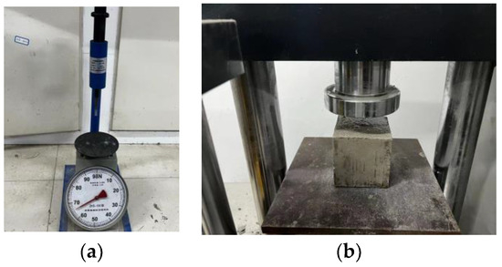 According to Figure 5a, the setting time was determined based on the specification JGJ/T70-2009 “Standard Test Methods for Basic Properties of Building Mortar” using a mortar setting time tester for the test. The prepared mortar was poured into the test container, and then the penetration needle of the instrument was slowly and evenly inserted into the mortar 25 mm deep at different times, the pressure scale readings were read, and the pressure scale readings on the instrument were the penetration resistance value. When the penetration resistance value reached 0.5 MPa (15 N), this was defined as the setting time of the mortar in h. According to Figure 5b on the compressive strength test, the prepared slurry was poured into the prepared 70.7 mm × 70.7 mm × 70.7 mm cube test molds and manually vibrated to load the molds, which were placed into the constant temperature and humidity box for 7d and 28d and taken out for the compressive strength test after the specified time.