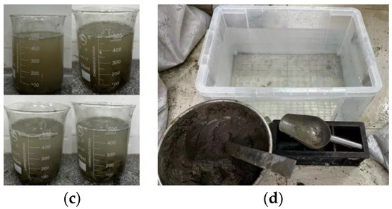 According to Figure 5c, for the pH value and turbidity value with reference to DLT 5117-2000 “underwater non-dispersible concrete test procedures”, we first added 800 mL of distilled water in the beaker, and then poured the prepared 500 g of mortar into the beaker ten times slowly with a hand towel. After three minutes of resting, 600 mL of water was sucked up with a glass pipette and used as a test for the pH value and turbidity value. According to Figure 5d, land and water strength ratio test involved the same ratio of cementitious materials molded in the water and air environments. When testing both the land and water strength ratios of the same age under compressive strength, we noted that the mold in the water should be completely submerged and kept at the level of the mold, the slurry should be slowly poured from the water surface height of the above into the test mold, and the preparation of the samples should be poured into the curing box after the completion of the provisions until the specified period.